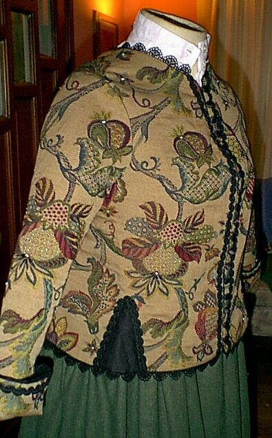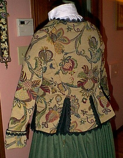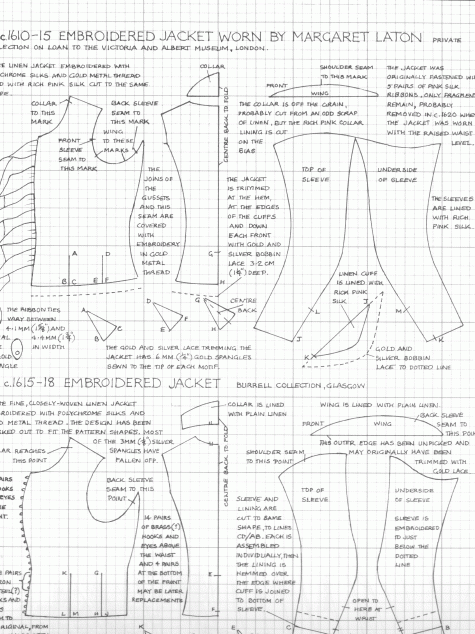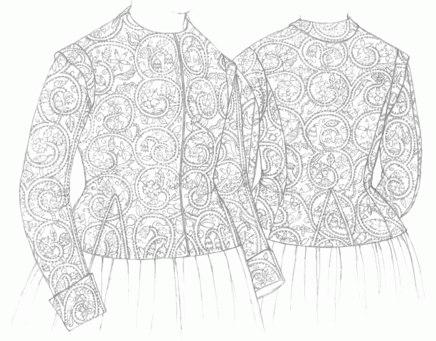 Left- Drawing of embroidered jacket (Arnold, Patterns of Fashion pg.120
