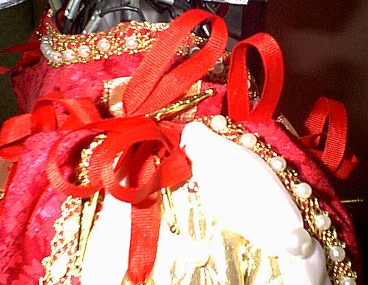 it to the bodice. I choose to put double ribbons with metal tip on the