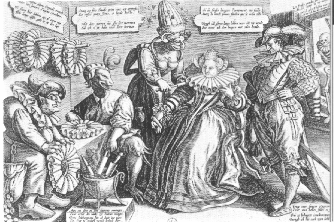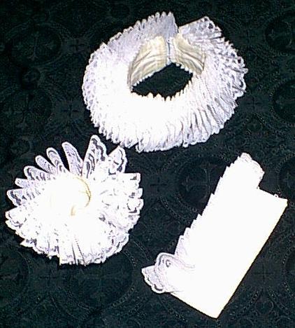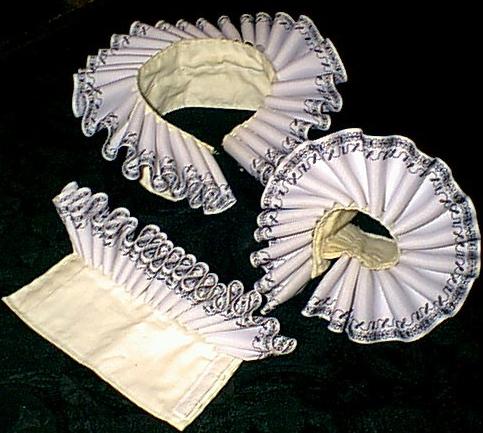 After much thought, I decided to devote an entire page to ruffs. Page 3 has my new standup ruff. No Elizabethan outfit is complete with out a ruff. Ruffs were worn by both sexes usually with a coordinating set for the wrists. Ruffs are made with the same technique of cartridge pleating that is used for the overskirts. A tutorial for making ruffs is located under Tudor Techniques. |