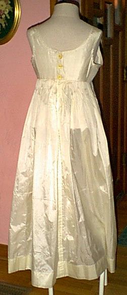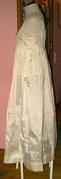 | I made the undergarments similar to the chemise that Lydia worn when she ran into Mr. Collins in the hallway. I decided to integrate the corset into the chemise. I noticed that there appeared to be boning under the back of the gowns but very little in front. I will not vouch for the authenticity of this design but is comfortable and does the job of providing the correct shape. |