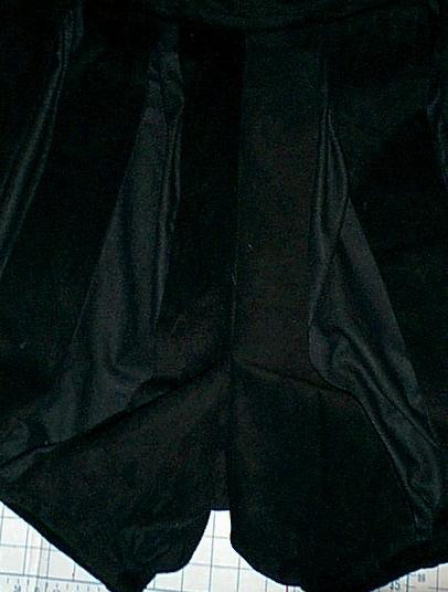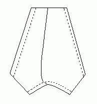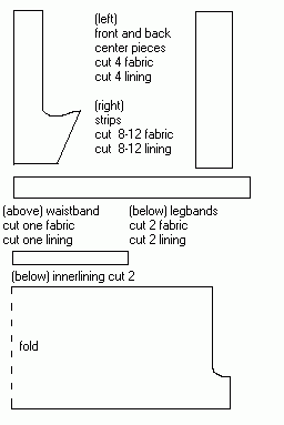 For example: The waist is 40 inches. The width (top) of the center pieces is 3 inches The width for the strips will be 3.5 inches 38-12= 28 and 28 divided by 3.5 = 8 Therefor 8 strips will be needed (4 on each side) Again remember to allow for seams The rest of the pattern is fairly easy to cut Cut the waistband wide (I use 4 inches) and cut the length 3 inches over the waist measurement. The leg bands should be 2 inches more then the thigh measurements and 2 inches wide. The lining is the entire width of fabric that has been folded in half lengthwise. The length should equal the length of the strips. Use the loop curve from the center piece to make the loop curve on the lining