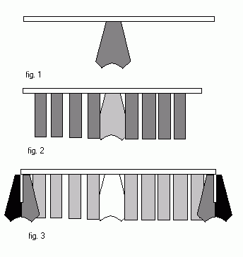 To prepare the lining. Assemble in the same manner as other pant patterns. First stitch the legs closed then stitch the two pieces together along the loop. Leave the same opening in the front to match the opening on the center piece. (example 3.1) Press the seam flat. I usually shirttail hem the ends for a finished inside. |
